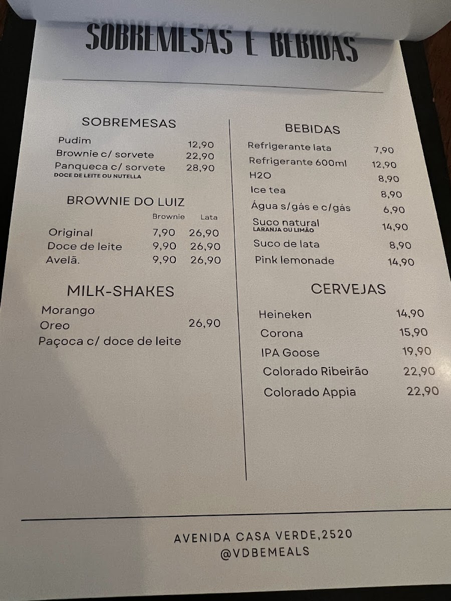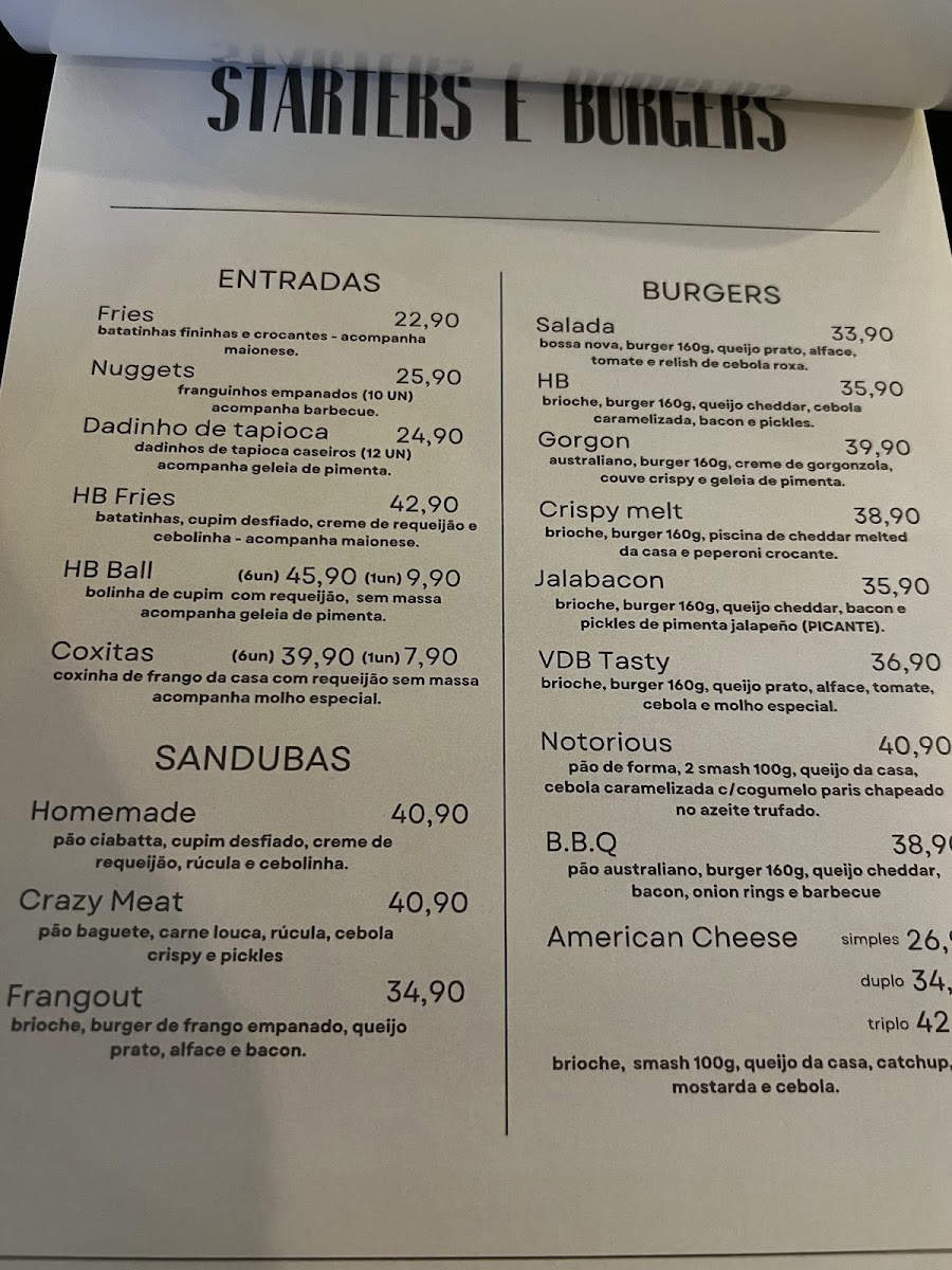 Vdb - Burger & Meals offers a diverse menu filled with mouthwatering options that cater to various tastes. For burger lovers, the American Cheese Burger comes in multiple variations, including the Duplo and Triplo options, perfect for those craving a hearty meal. The HB Salada and HB burgers also make for great choices. If you're in the mood for starters, try the crunchy Coxitas, crispy Fries, or the savory HB Fries. Other snacks like HB Balls (6 pieces) and Nuggets de Frango (10 pieces) are great for sharing. Moving on to the sandwiches, there's something for everyone, from the comforting Homemade and Frangout to the indulgent Crazy Meat and Fatty. The Choripán stands out as a flavorful option as well. For those seeking hearty meals, the Omelete - Executivo and Comercial versions offer protein-packed options, as do the Linguiça Toscana and Calabresa dishes in both Executive and Commercial forms. The Parmegiana section features classics like the Bife a Parmegiana and Frango a Parmegiana, with the unique Beringela a Parmegiana catering to vegetarians. The salad offerings include the refreshing Salada Caesar and the house favorite, Salada da Casa. Pasta enthusiasts can indulge in dishes like Gnocchi Recheado, Sofiatelli, and Linguine. Finally, satisfy your sweet tooth with decadent desserts such as Pudim, Churros de Rolo, and a variety of delicious brownies, including the Original Brownie, Brownie Doce de Leite, and Brownie de Avelã. With such a wide array of dishes, Vdb offers a flavorful experience for every craving.